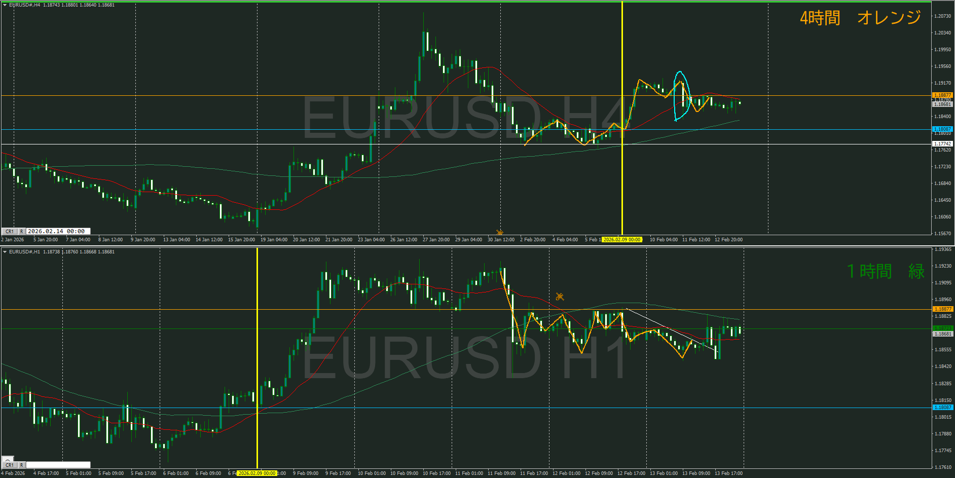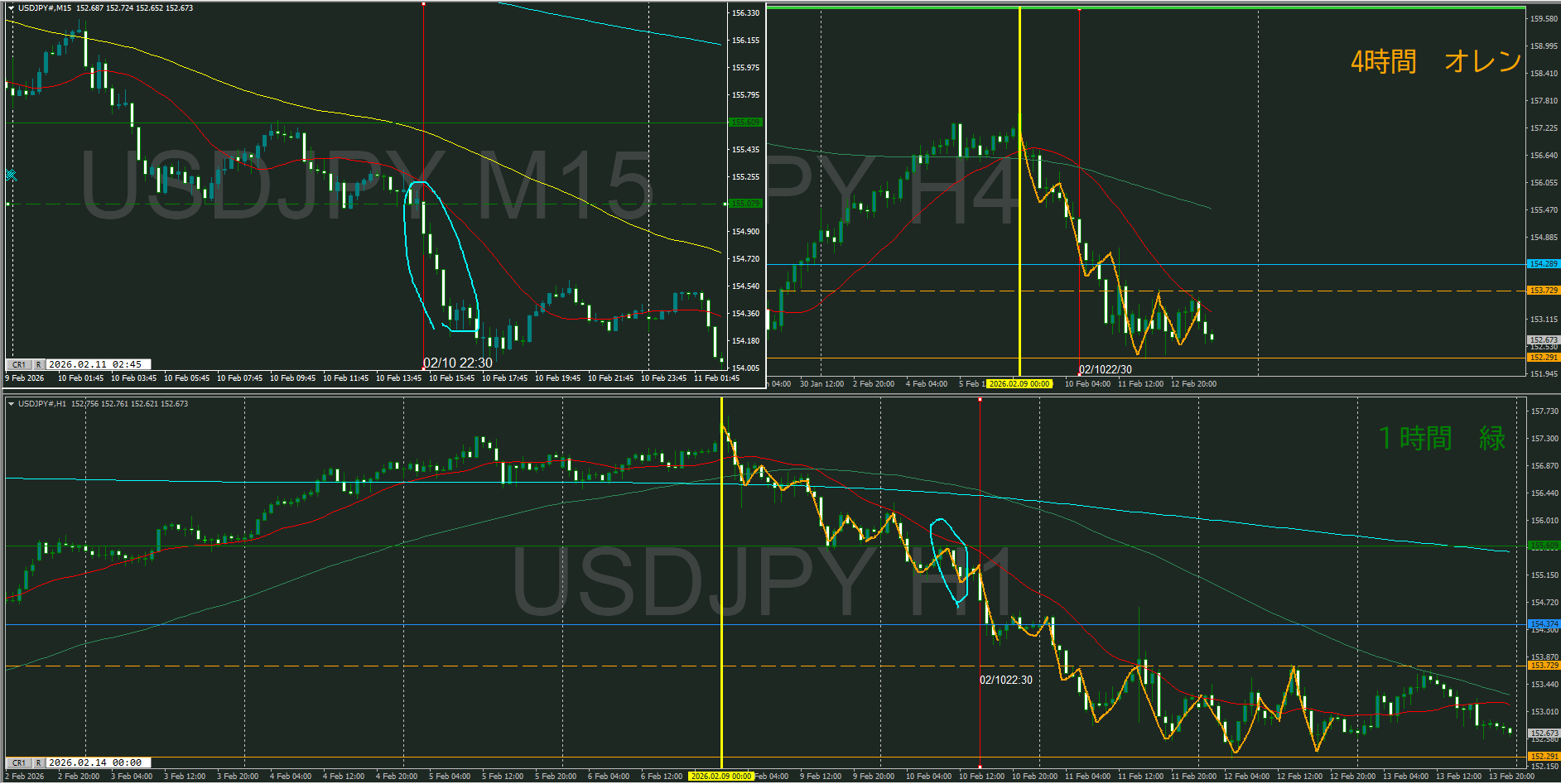 今週は4時間としては足が早く、1時間でも調整からの下落でトレンドwお作ってきたのが10日 火曜日