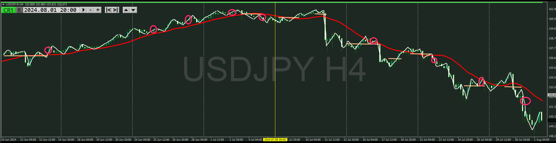 【4時間】方向下 トレンド転換シグナルが出て戻している波の途中