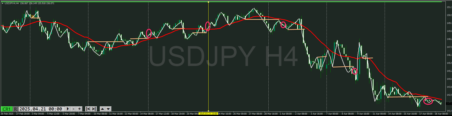 【4時間】方向下 トレンド転換シグナルが出て下落の波の途中