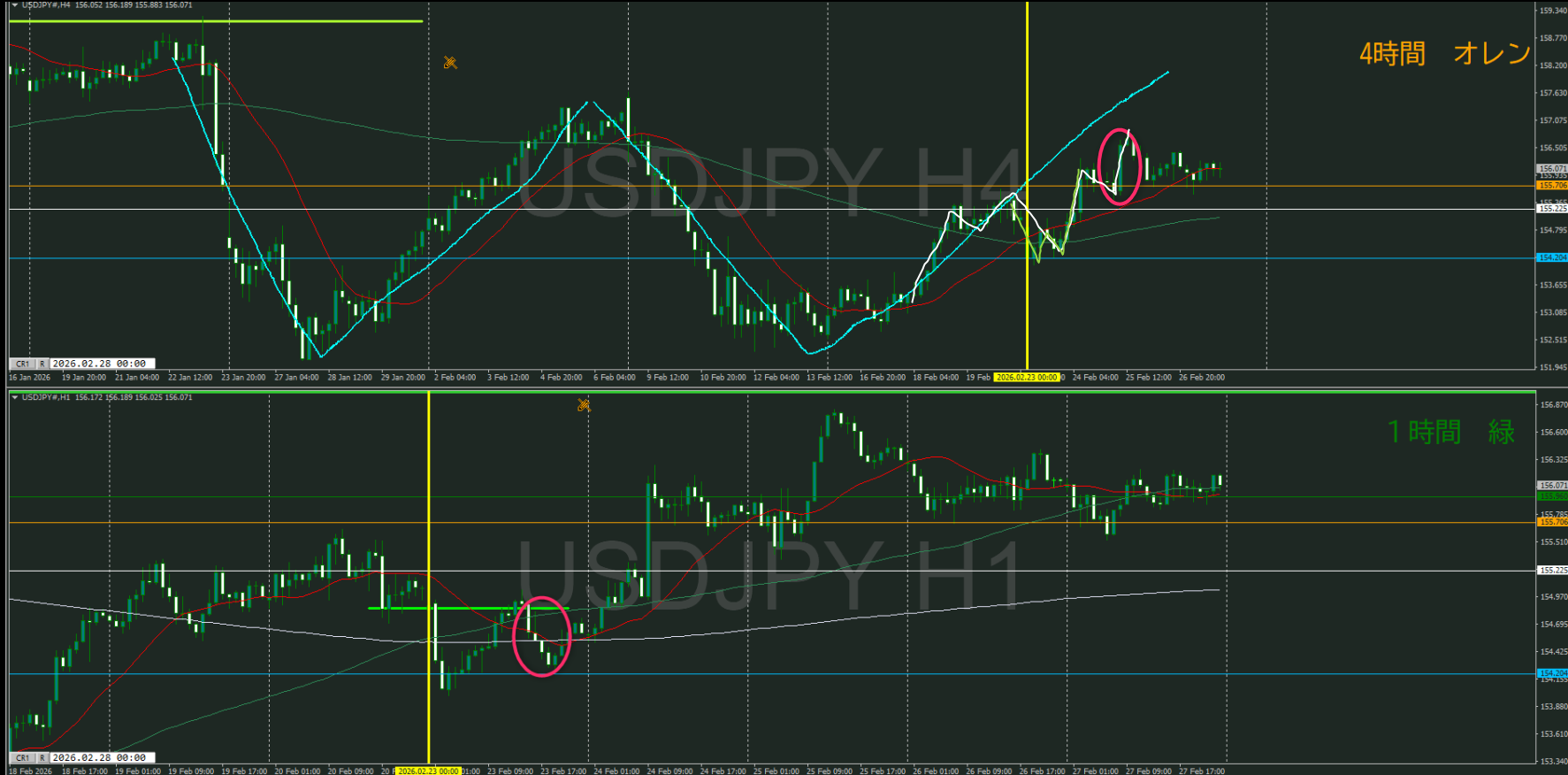 自分は二番底と視たので1時間の上昇トレンド発生待ちだったので、獲れない