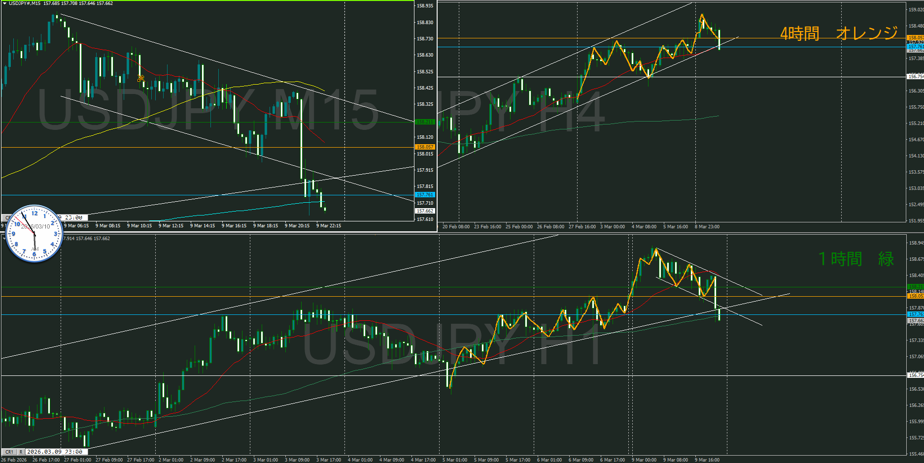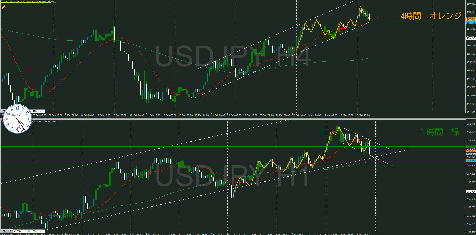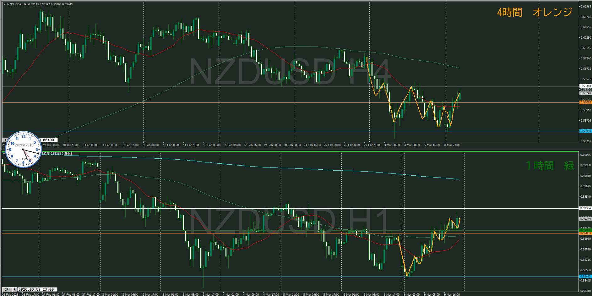 まだ5時前なので4時間足が確定していないけど、暫定としておく