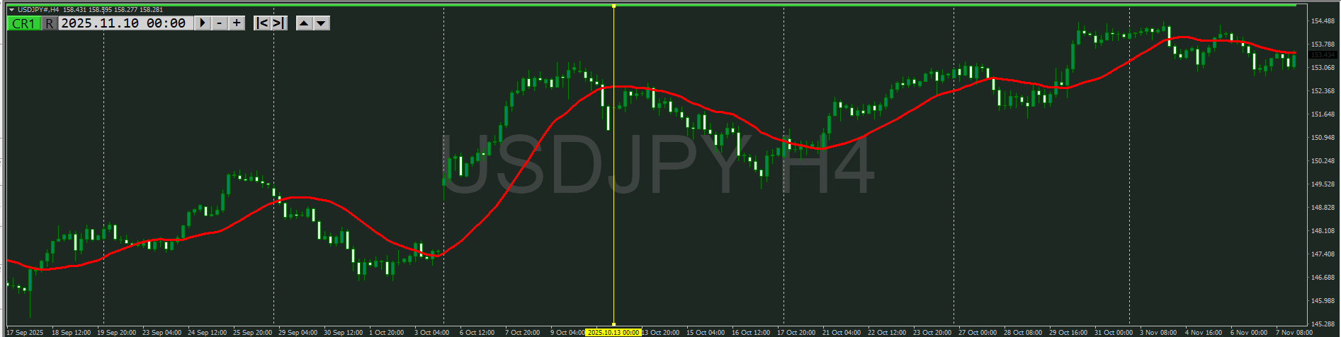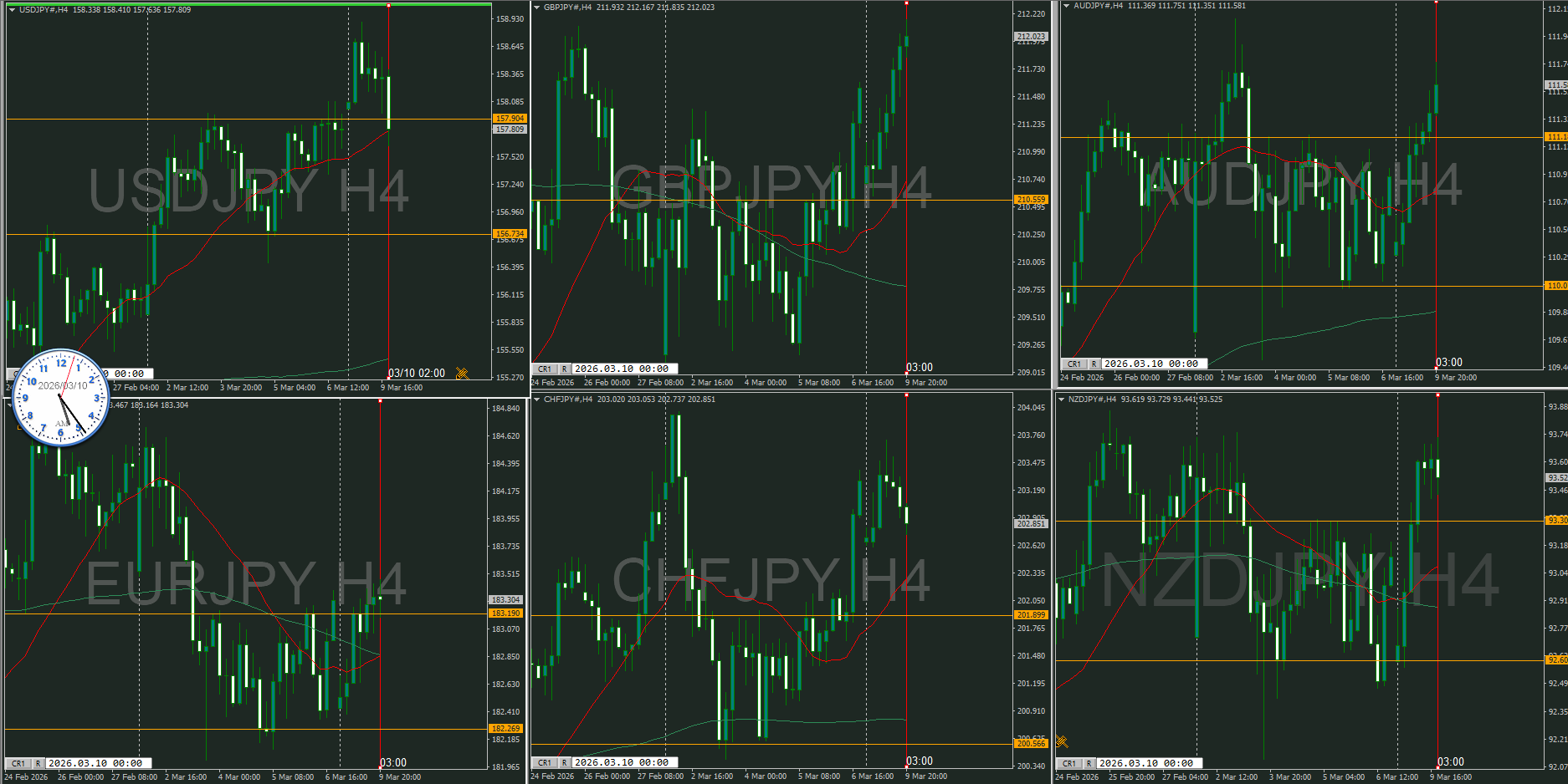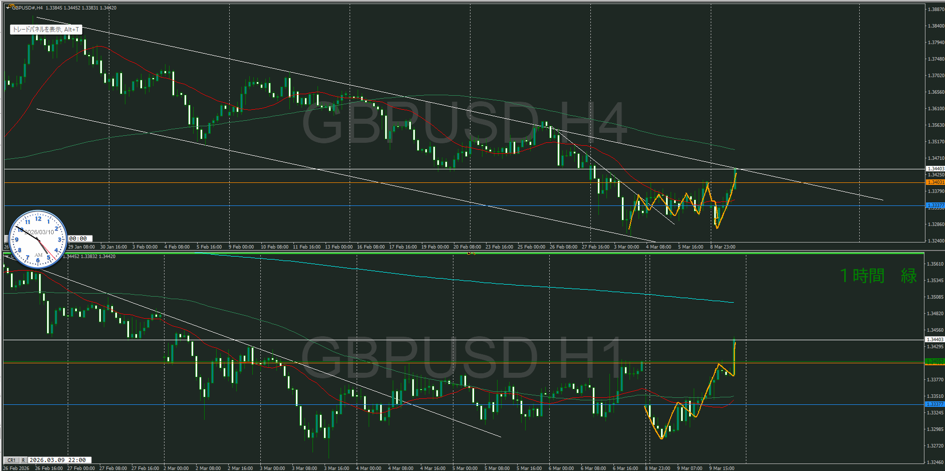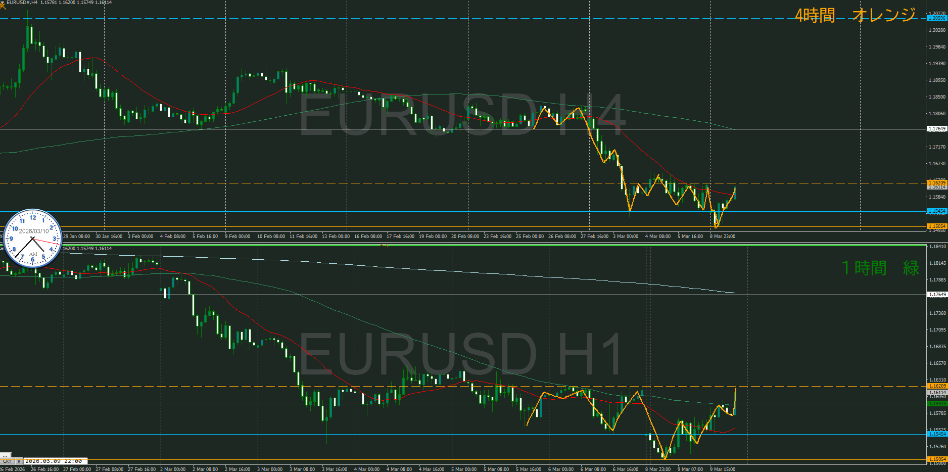 まだ5時前なので4時間足が確定していないけど、暫定としておく