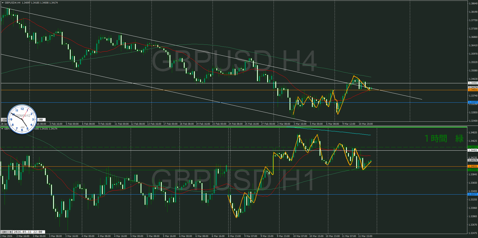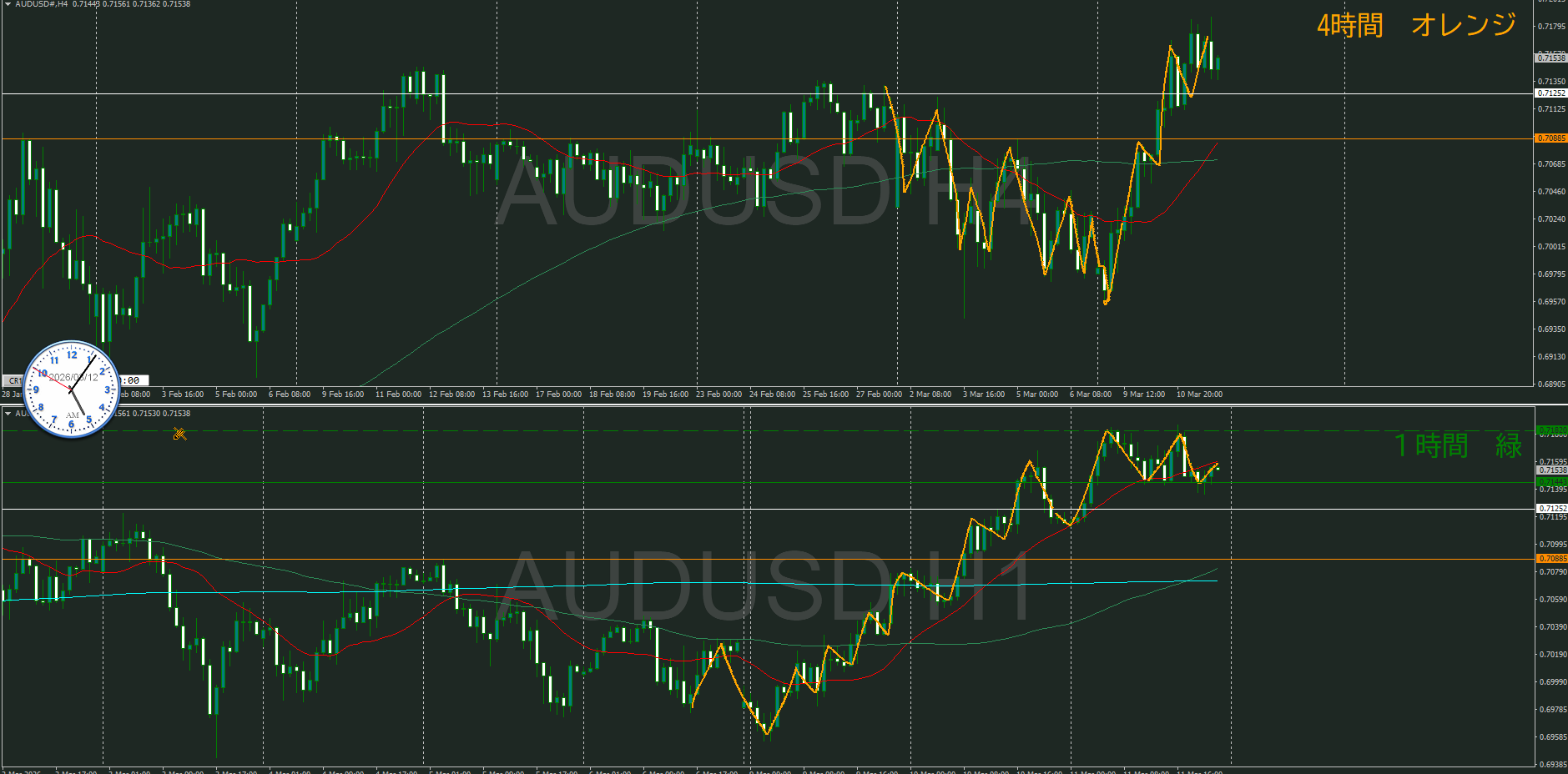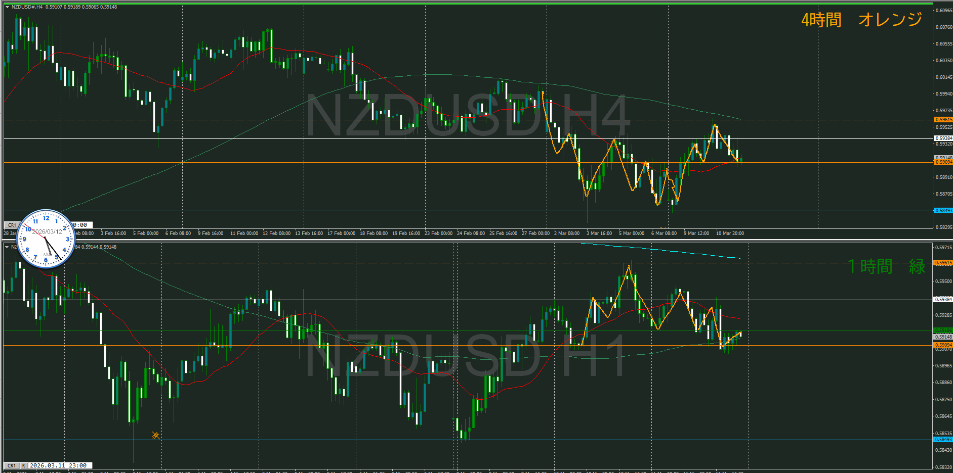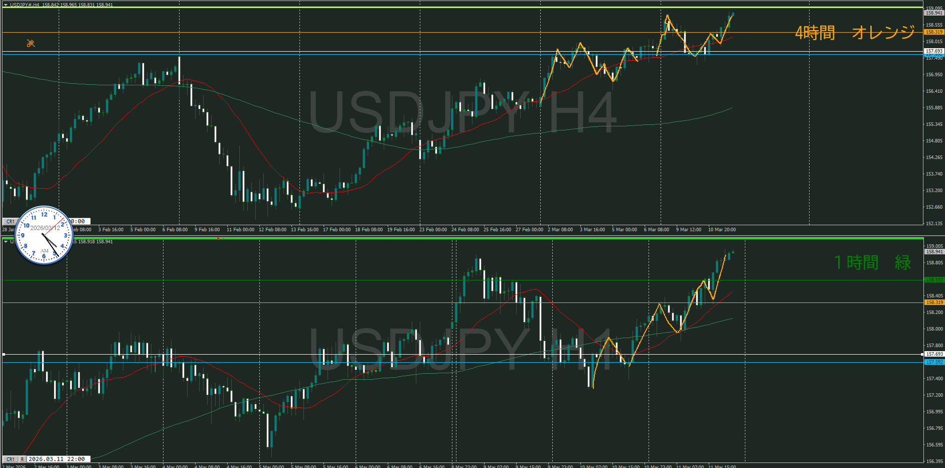 4時間を視るとトレンドの角度が鋭角過ぎるのが気になる