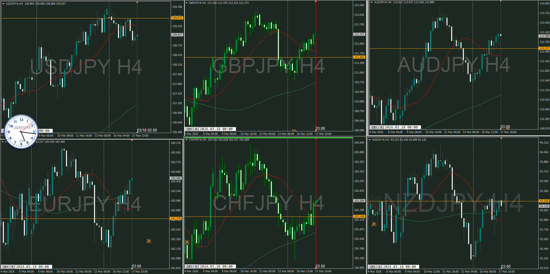 ドル円だけが上向きから下を向きはじめているが、他の通貨は下向きから水平になりはじめるるうかペアが多い