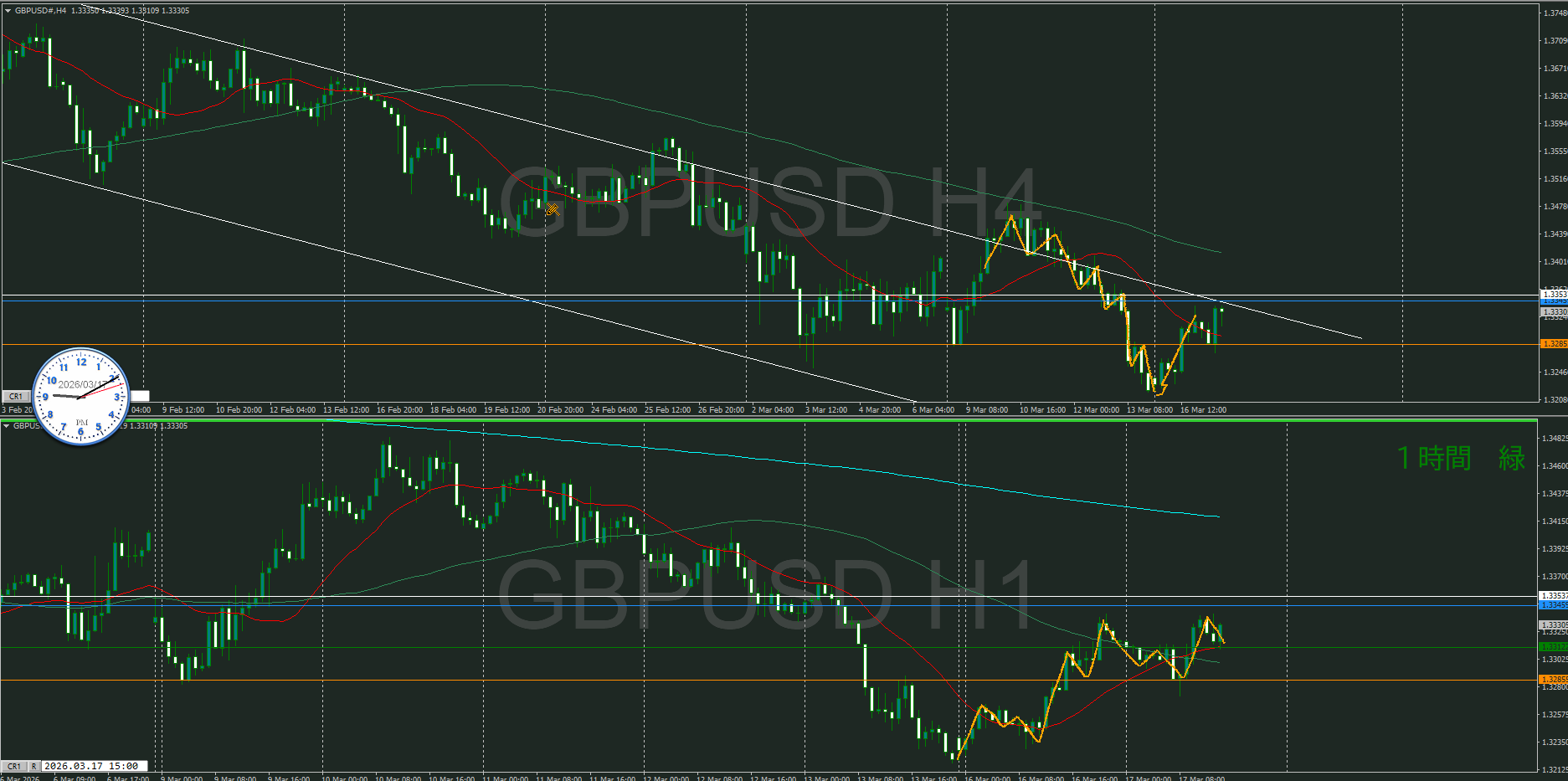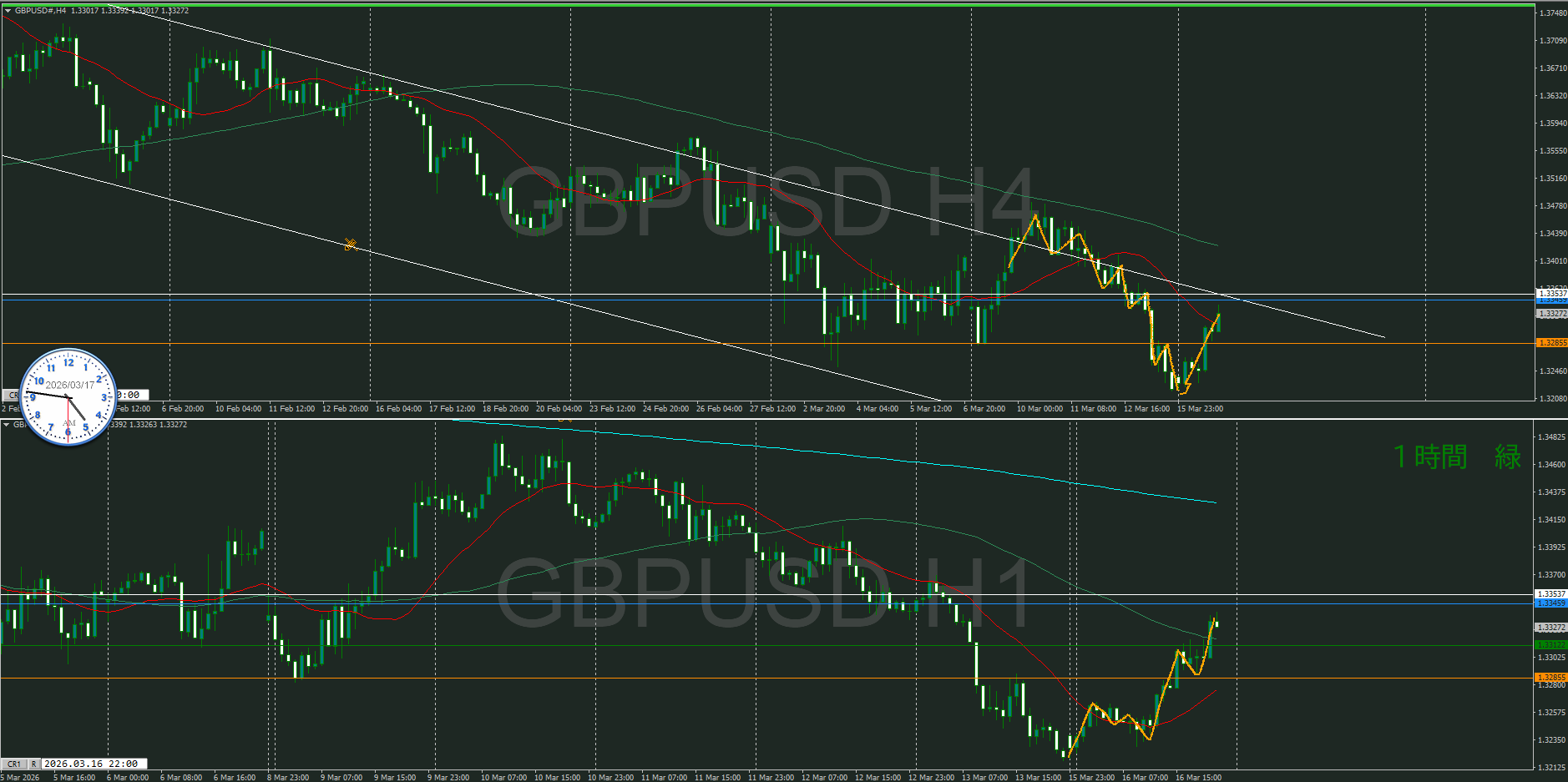 1時間の押し目買いが視えるけど、真上には堅い日足の斜めとレジスタンスラインが視える