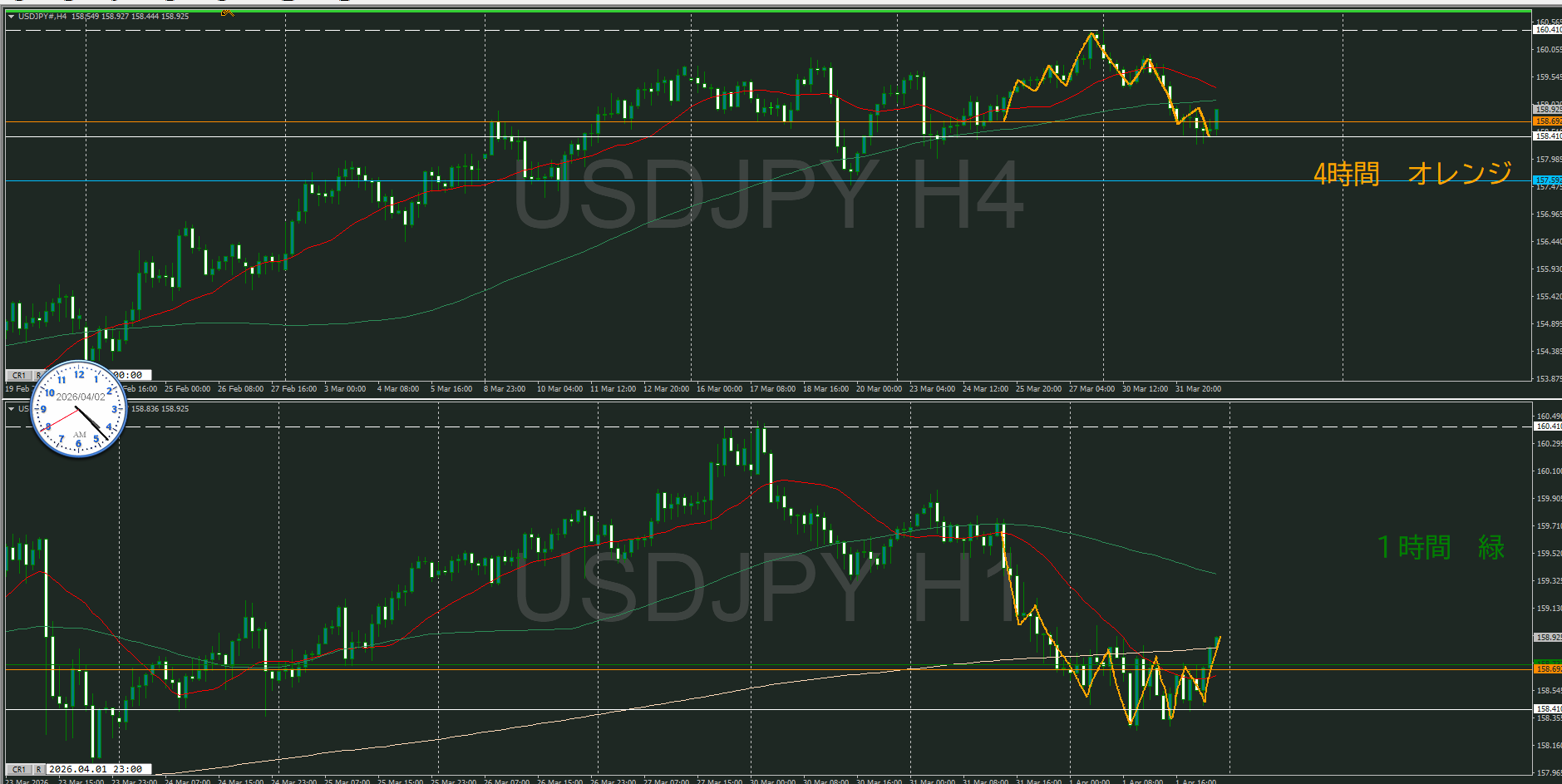4時間の押し目買いも見えているけど、日足のMAが抑えに来ているので、買いも怪しい