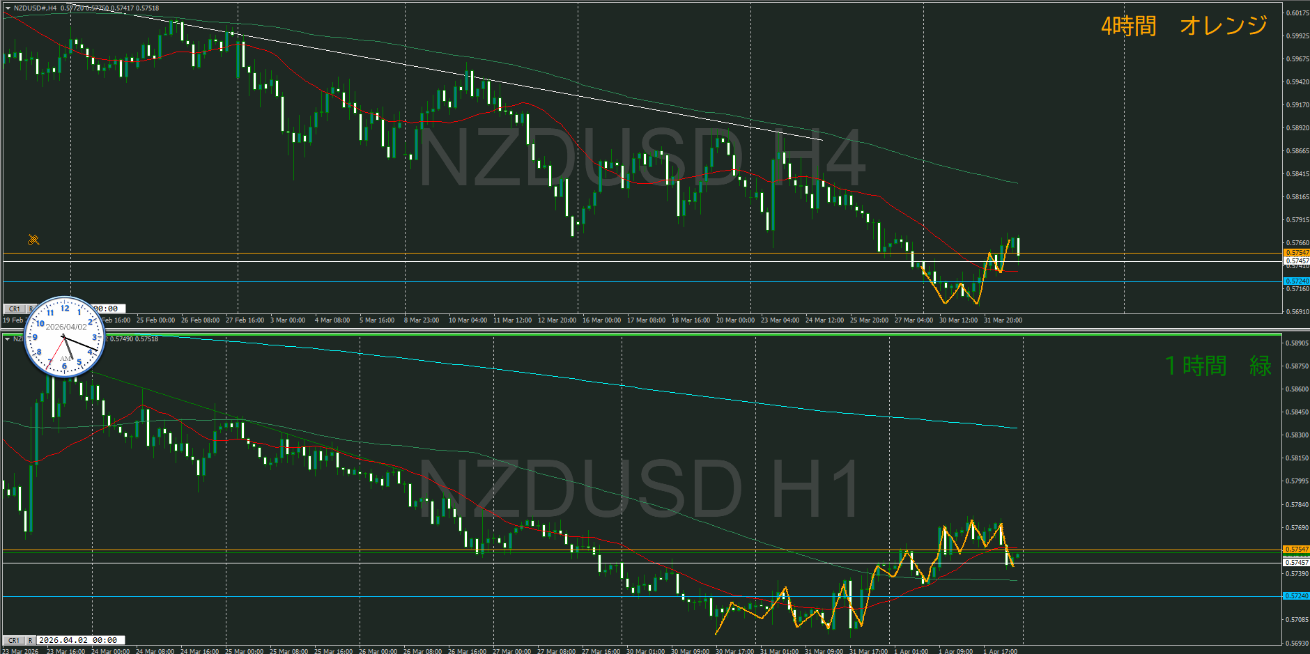 【1時間】方向上 上昇トレンドが否定され調整に入ったところ