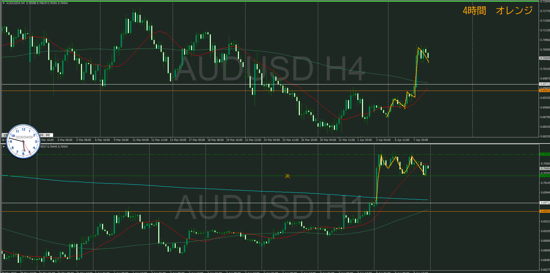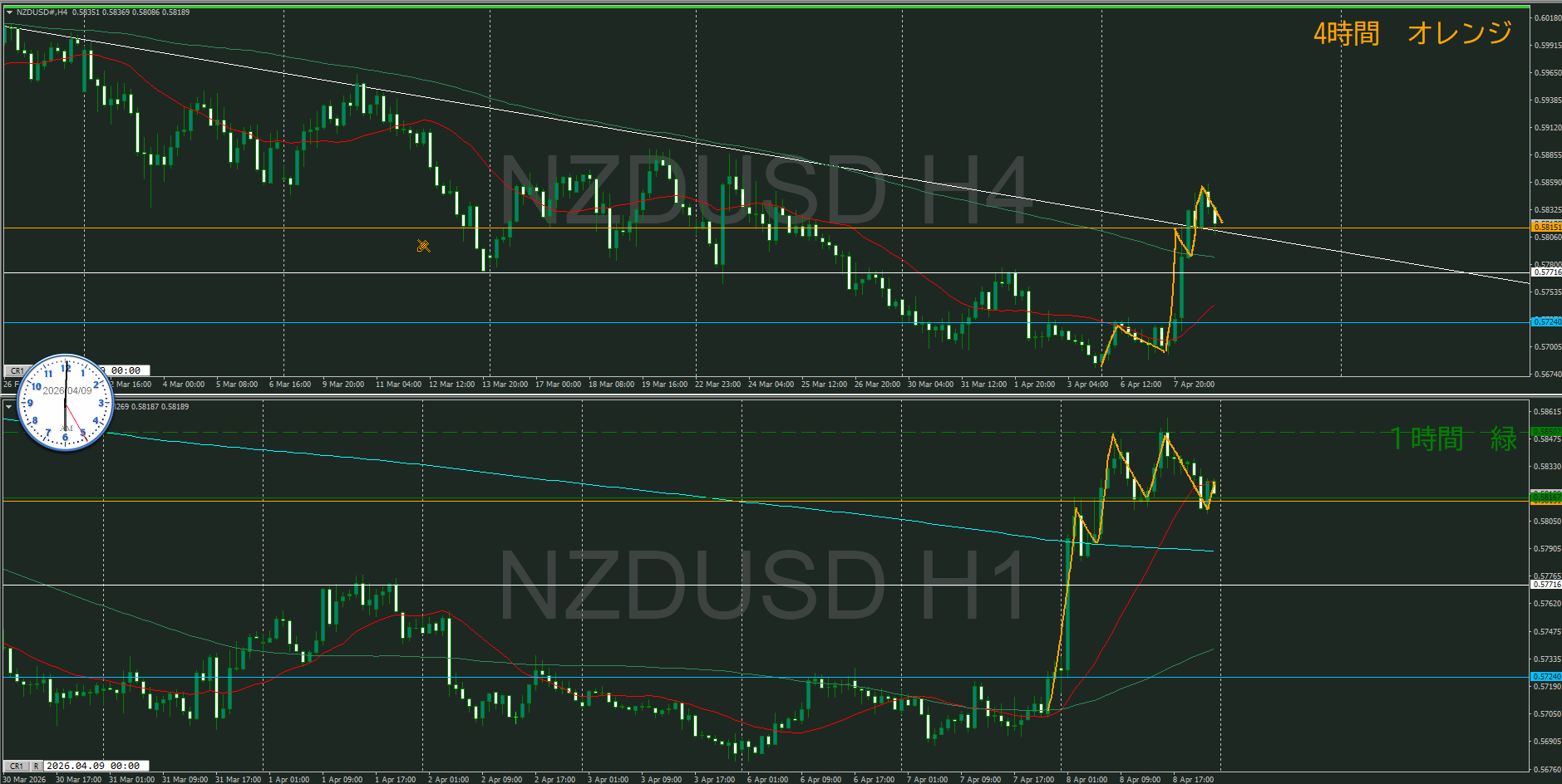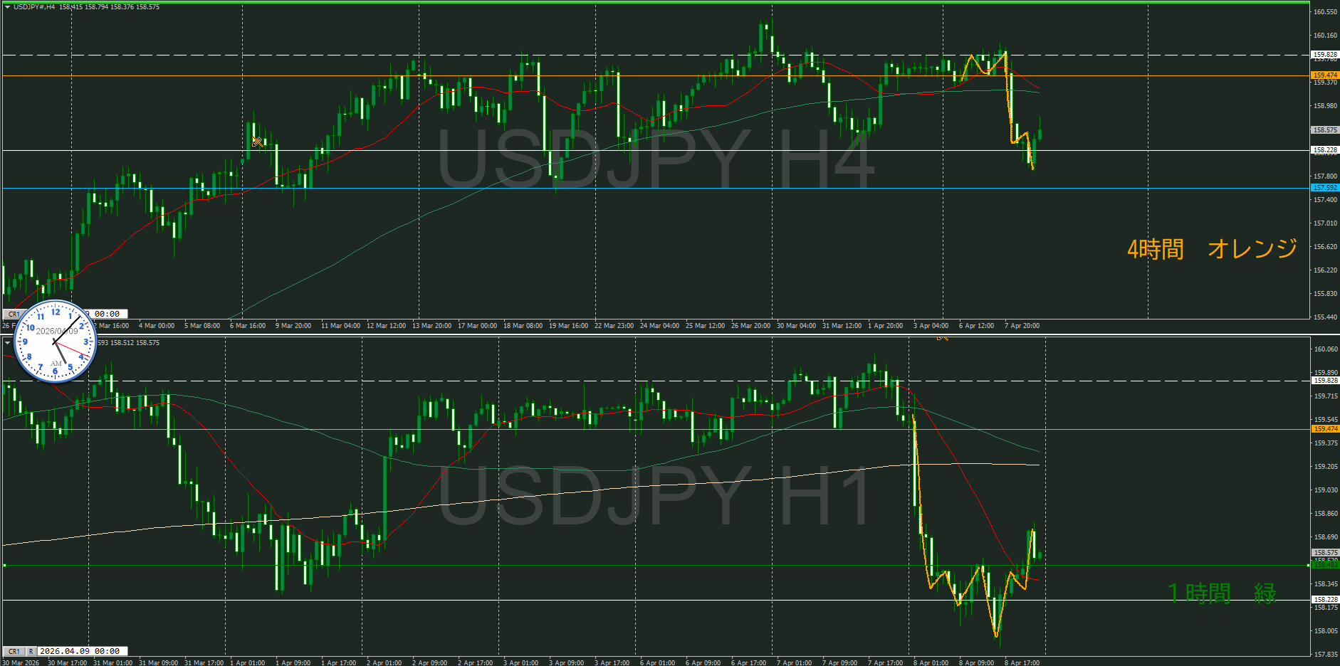 4時間を視ると日足のサポートの真上にいるので、そのサポートが機能してくるのかが焦点