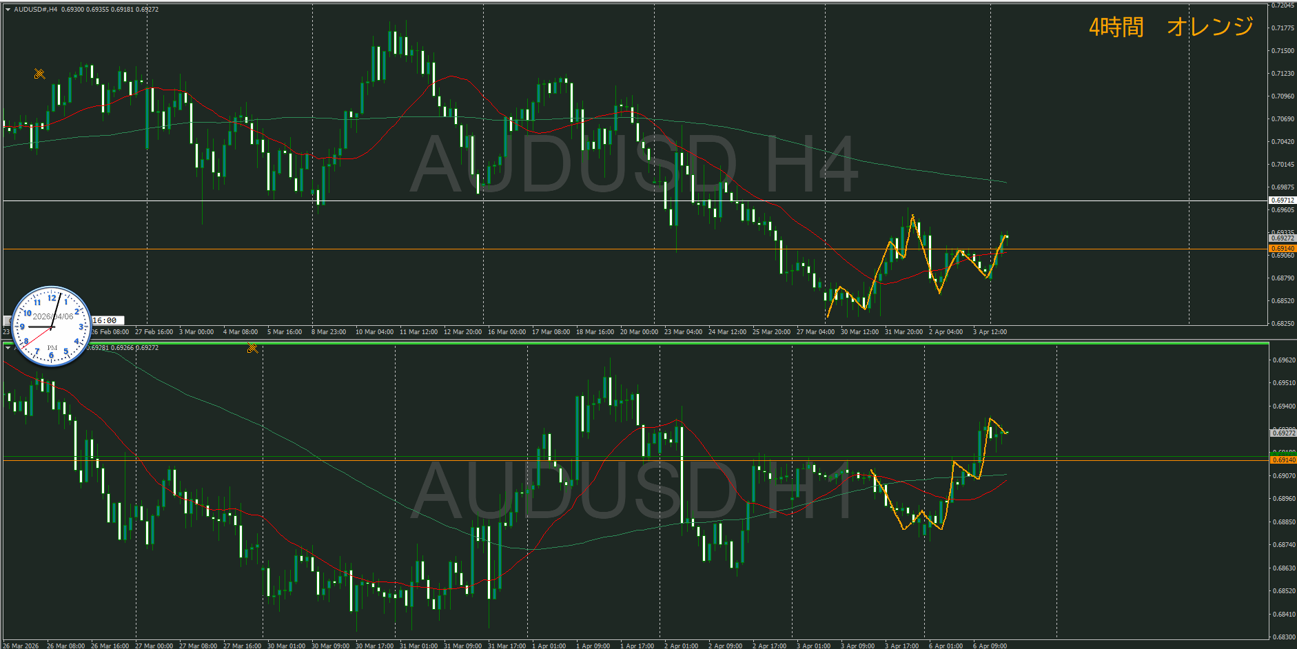 4時間で安値を割って来たら、売りを検討する