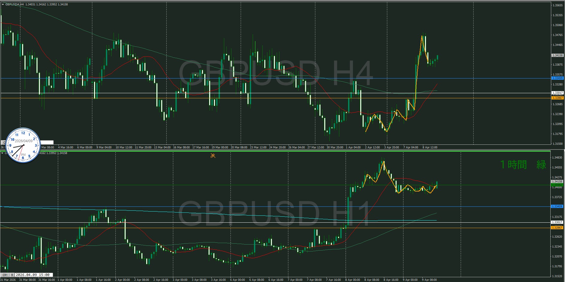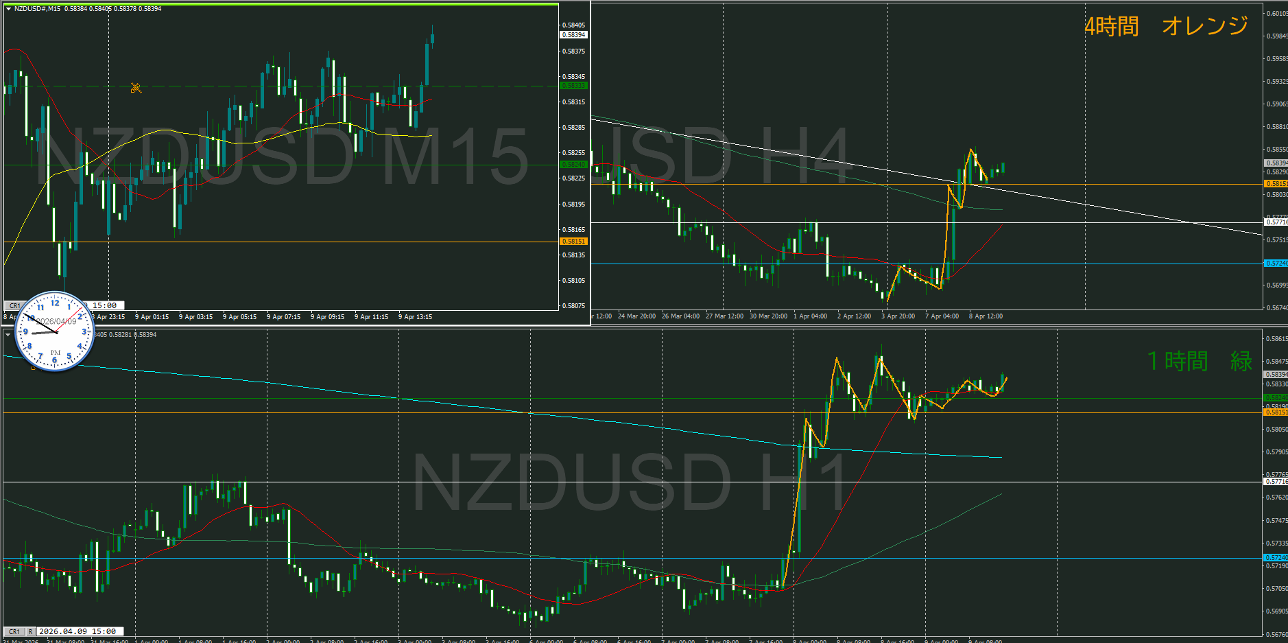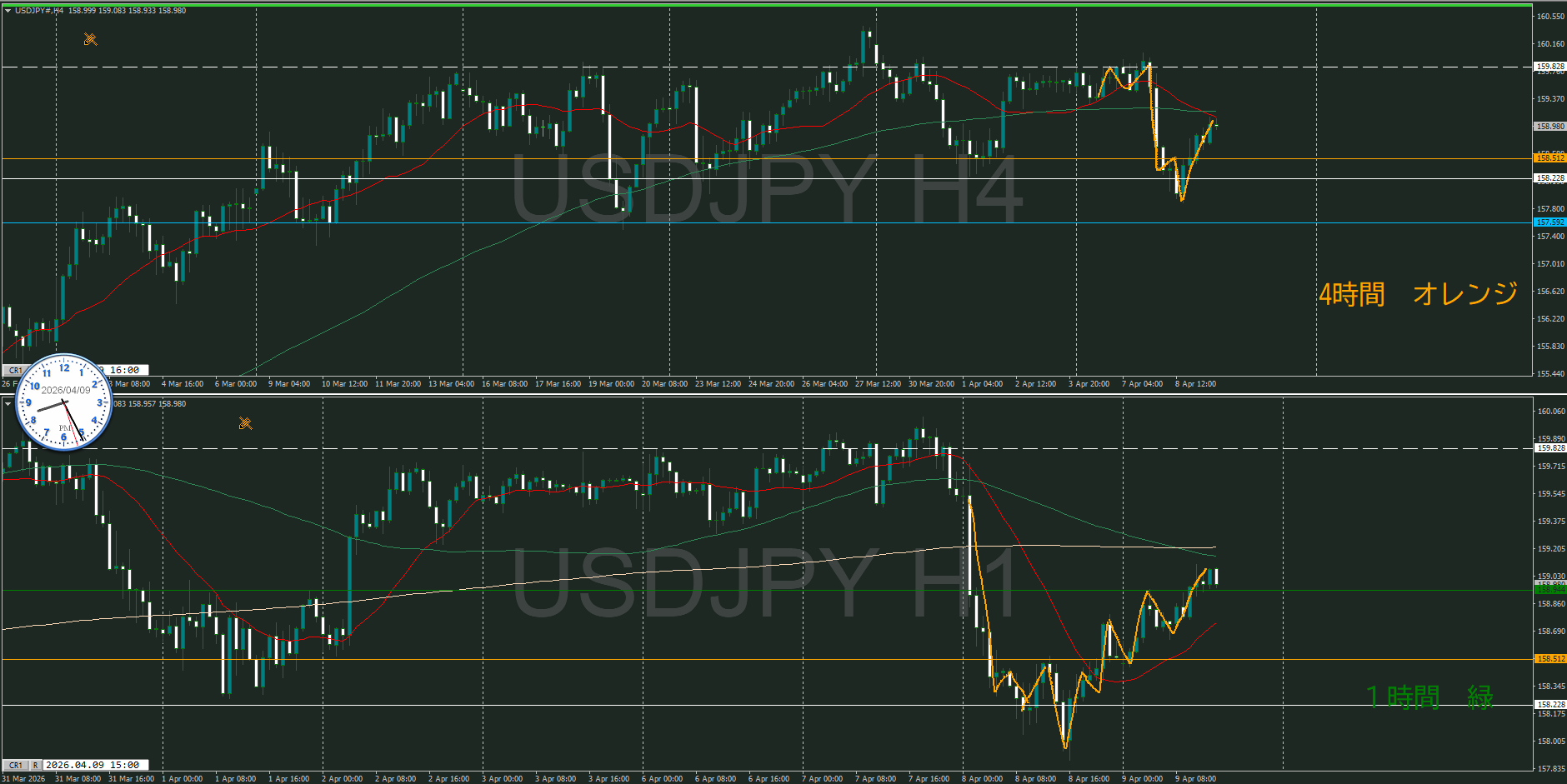 4時間を視ると日足のサポートの真上にいるので、そのサポートが機能してくるのかが焦点