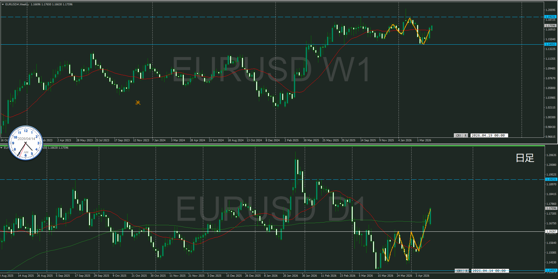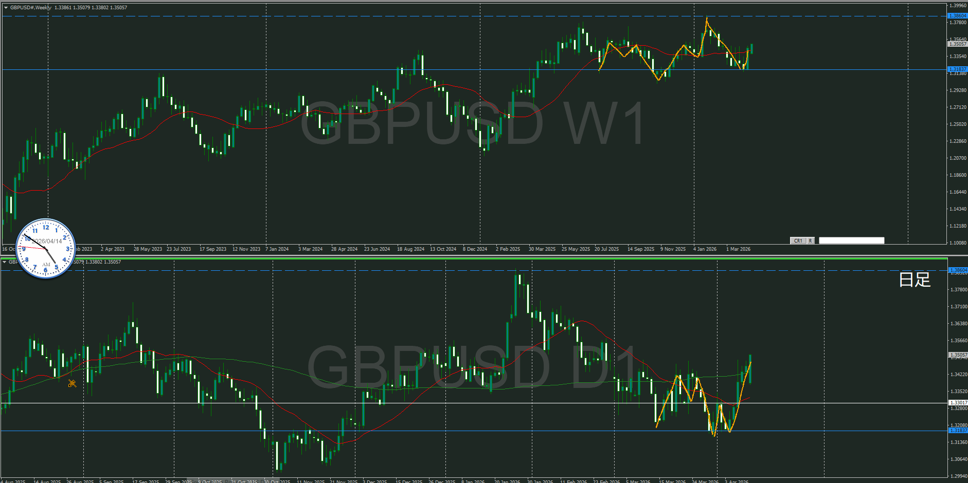 週足は方向下だけどMAを超えて買いが強くなっているところで、日足上昇の波の途中