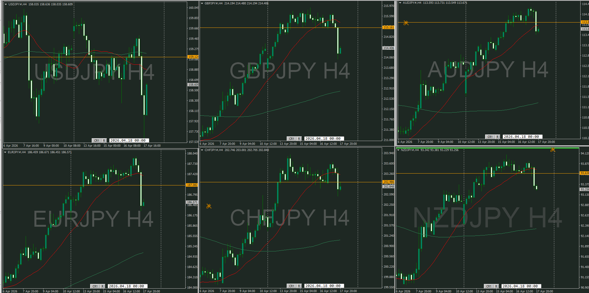 その他の通貨ペアは日足MAは水平から上に向きはじめたものが多く4時間が上に居るので、まだ本格的な売り目線ではない