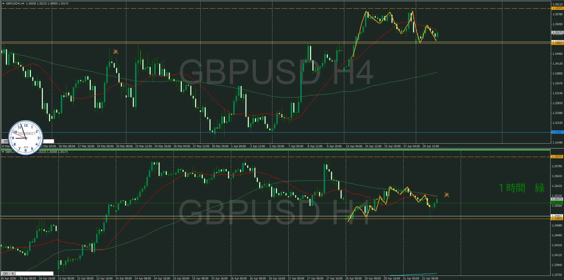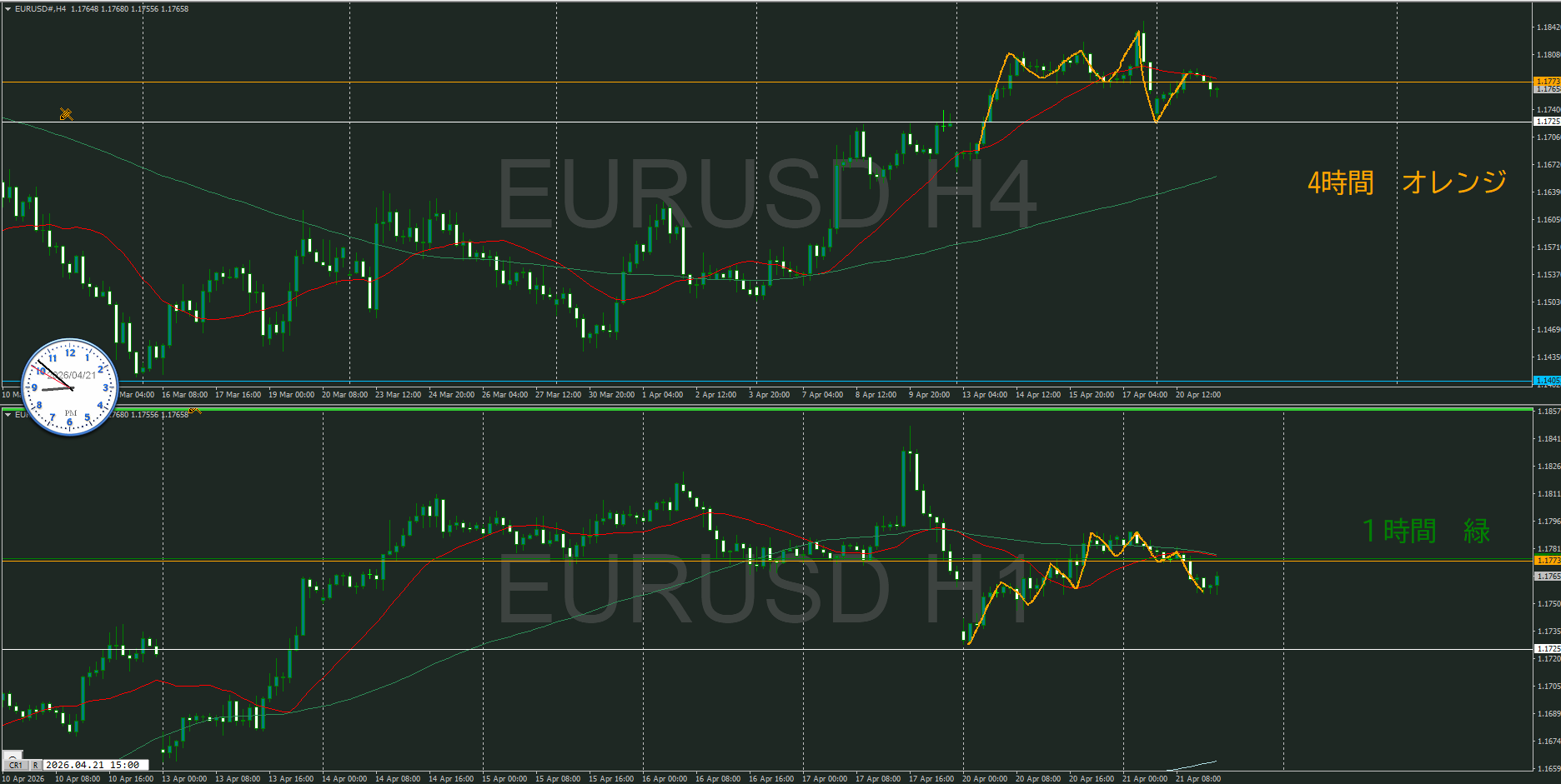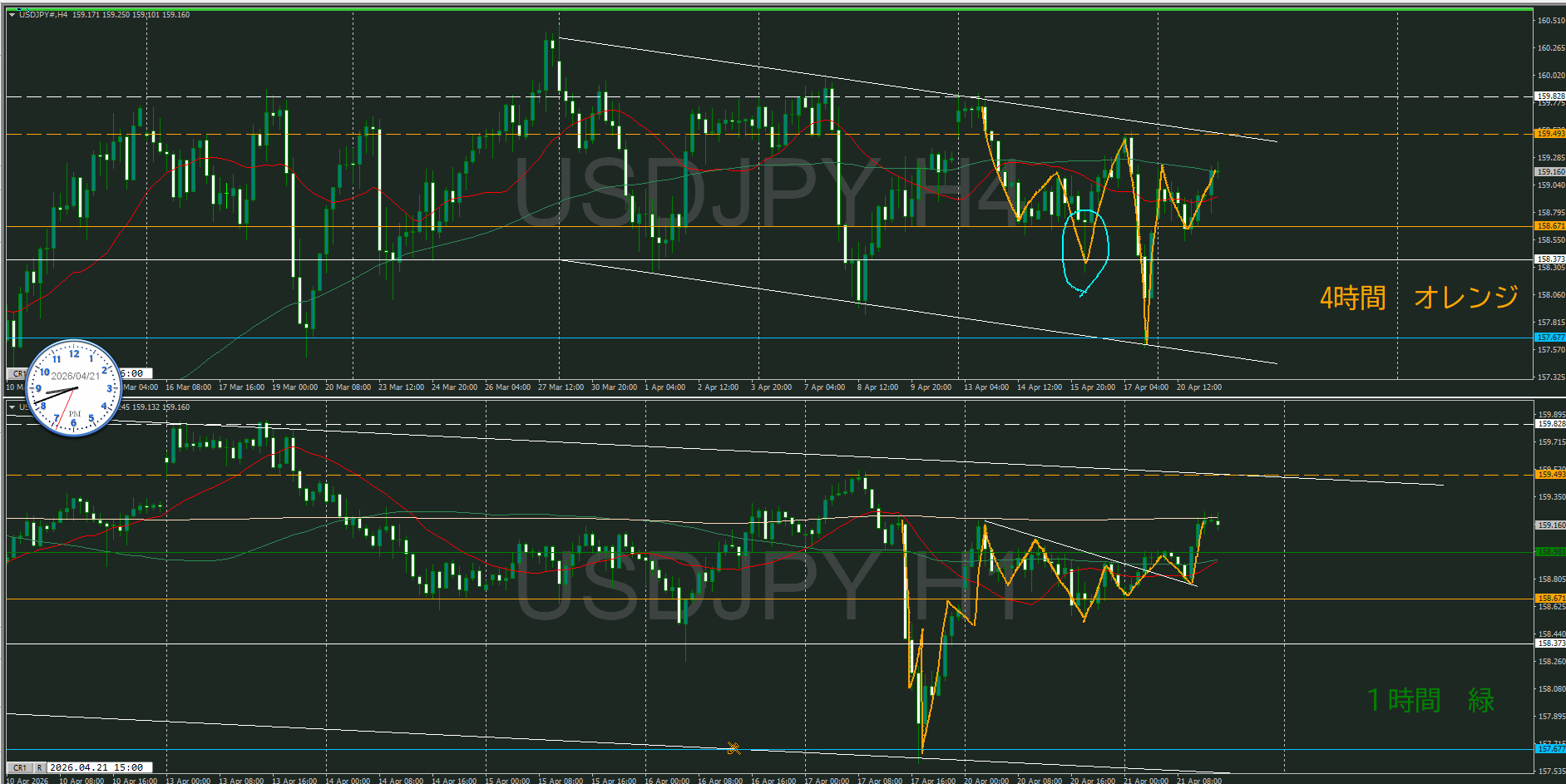 4時間足もまだ確定ではないけど、日足MAが売り抑えて来ている様子が1時間で視える